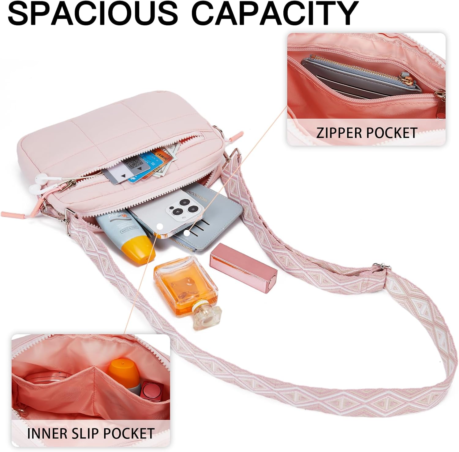 The crossbody bags for women sizes 9*1.5*6 inches (L x W x H). Large capacity can easily fit your daily essentials. On the inside, it also features a convenient zipper pocket and inner slip pocket for storing your cards and wallet. Back zipper pocket protect your things safty.