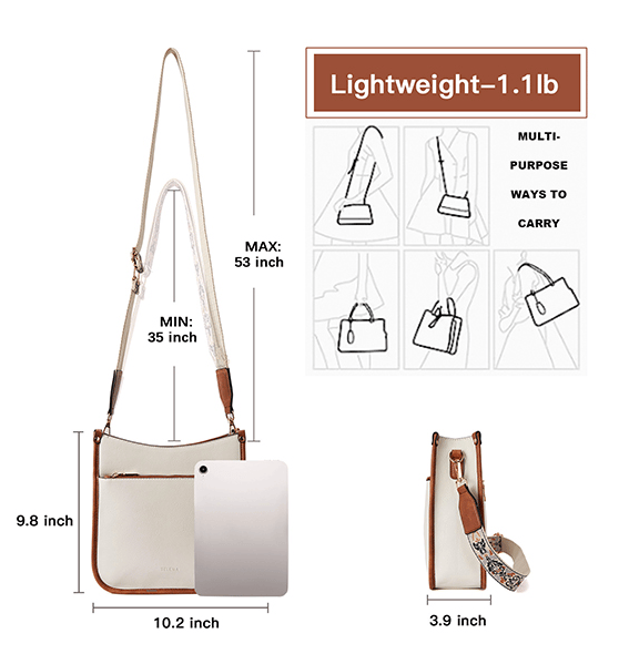 The Lightweight crossbody purse size:(L) 8.66" x (W) 2.36" x (H) 6.29". Shoulder strap size:35.83"-56.69". Weighs only 0.73 lbs. Comes with 1 adjustable and removable fashionable wide strap, can be used as a crossbody bag or shoulder bag.